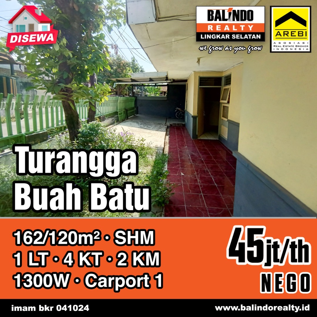 Kontrakan sederhana dan nyaman di Turangga, Bandung. Terdiri dari 5 KT & 2 KM, LT/LB: 160/120m². Harga ekonomis 45 Juta /tahun. Dekat fasilitas umum.