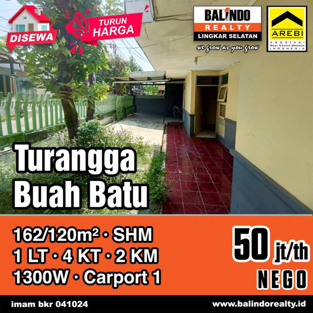 Rumah disewakan murah di Turangga, Bandung. Luas tanah 162m², LB 120m², 4 kamar tidur, 2 kamar mandi. Harga sewa hemat: 50 Juta /tahun. Cocok untuk keluarga kecil.