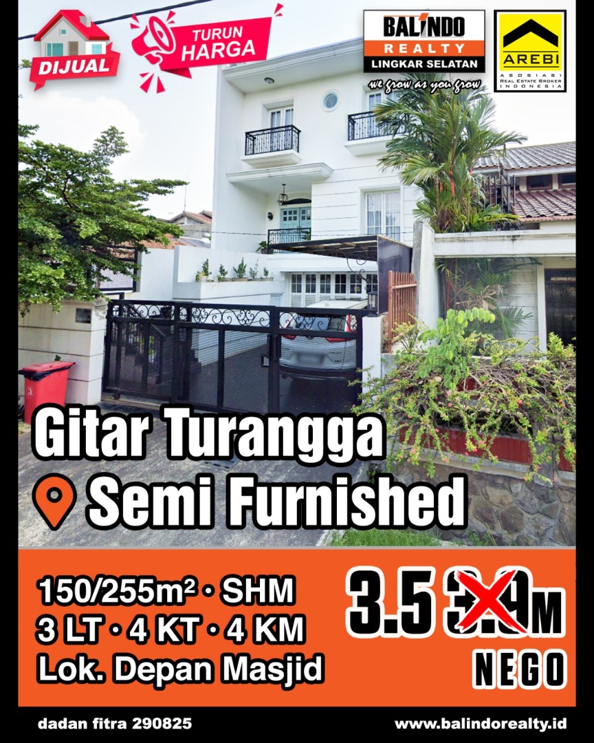 Rumah luxury siap huni di Turangga, Bandung. Hunian elit dengan 4 kamar tidur dan 4 kamar mandi, LT 150m², LB 255m². Harga eksklusif: 3,5 Miliar. Fasilitas sekitar lengkap.